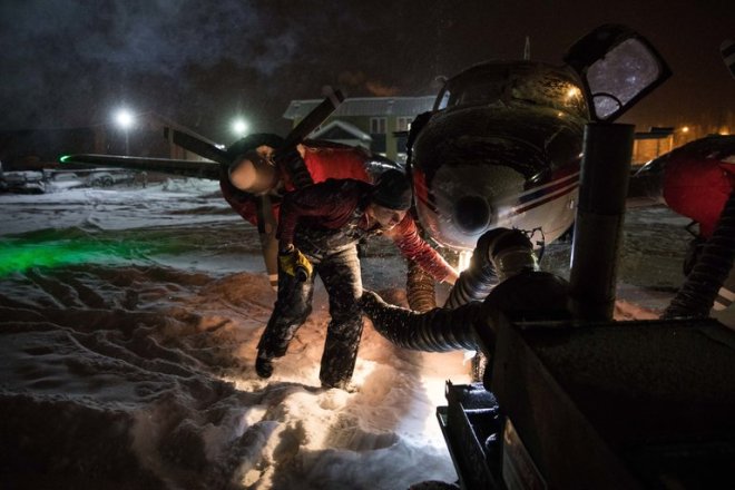 Matt Gallagher, a pilot for Warbelow’s Air, cleaning snow off a plane in subzero temperatures in Fairbanks. Credit Ruth Fremson/The New York Times