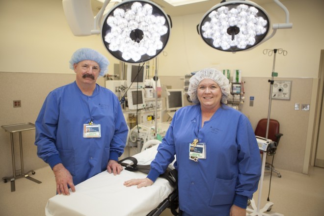 Surgical techs Curtis Phelps, left, and Kristi Brooks pose for a photo in an operating room at Providence Alaska Medical Center in Anchorage, Alaska on Wednesday, April 5, 2017. Brooks is the director of UAA’s surgical technology program. (Photo by Phil Hall / University of Alaska Anchorage)
