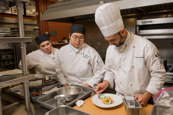 Chef Noah Miller instructs Culinary Arts students Jannie Mangalus and Shelby Boos during Miller’s A la Carte Kitchen and Culinary Skill Development laboratories in Lucy Cuddy Hall’s Bakery.
