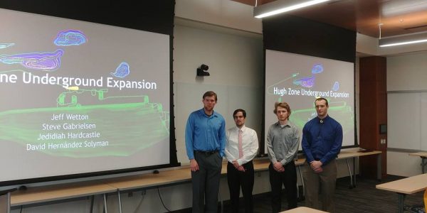 Steve Gabrielsen, Jeff Wetton, David Hernandez and Jed Hardcastle won first place in the 2018 Society for Mining, Metallurgy and Engineering Pittsburgh Coal Mining Institute of America mine design contest. Mining students from around the country submit their capstone design reports.