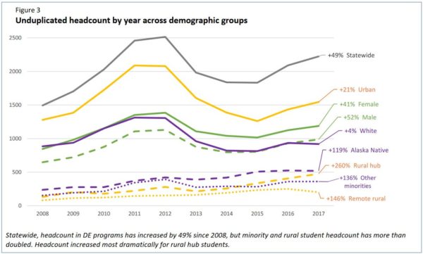 Dual enrollment programs provide access to college-level courses to high school students prior to graduation, often helping students become more successful in high school and easing their path to college. Between 2008 and 2017, University of Alaska (UA) dual enrollment programs experienced an 85 percent increase in student enrollment and, among those who graduated from high school, 41 percent went on to attend a UA institution within a year.