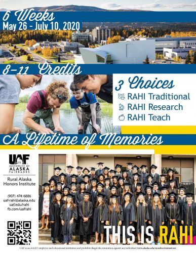 The application period for the 2020 Rural Alaska Honors Institute, May 26-July 10, is now open. Applications are due by March 1.