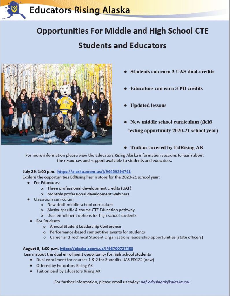 Educators Rising Opportunities Educators Rising will be offering multiple opportunities for middle and high school students, as well as educators over the coming academic year. You can download the above flyer here:Download Source: Educators Rising Alaska Share this:Share Click to share on Facebook (Opens in new window) Facebook Click to share on X (Opens in new window) X Click to print (Opens in new window) Print Click to email a link to a friend (Opens in new window) Email Like Loading... Related