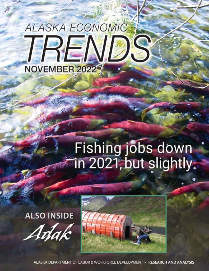 In November Trends: Seafood harvesting employment declined slightly in 2021 after a large drop in 2020. The pandemic was less of an obstacle in 2021 than the year before, but restrictions and outbreaks continued to put a damper on the industry. Also in this issue: Hope is on the horizon for the community of Adak. A private consultant is working to secure a new plant operator to reopen the processing plant in 2023, and the Port of Adak will receive $10.1 million in federal infrastructure funding this year.