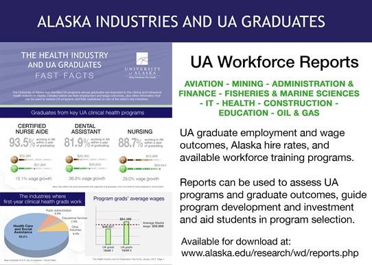 In preparing the reports, the university analyzed labor market information to identify the largest and fastest-growing occupations in the nine industries, then linked related UA programs to those jobs. Detailed employment and wage information was extracted from employer quarterly reports filed with the Dept. of Labor. That means the numbers are based on a comprehensive match of all graduates who remain and work in Alaska.
