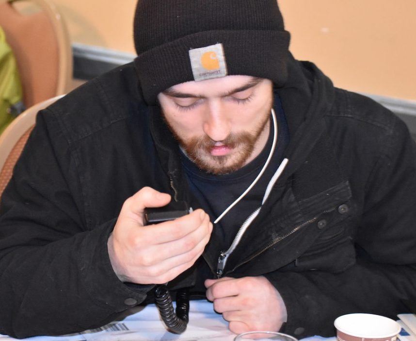 A young fisherman practices Mayday calls at the Alaska Young Fishermen’s Summit. Photo by Dawn Montano/Alaska Sea Grant.